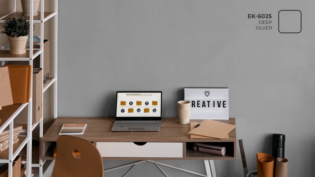 EK-6025 Deep Silver dapat memberikan sentuhan modern yang berkelas untuk berbagai interior. Rona abu-abu yang dalam ini akan membuat ruangan tampak lebih tegas dan hangat. Warna ini cocok digunakan pada area seperti ruang tamu atau ruang kerja yang menonjolkan kesan profesional atau elegan.