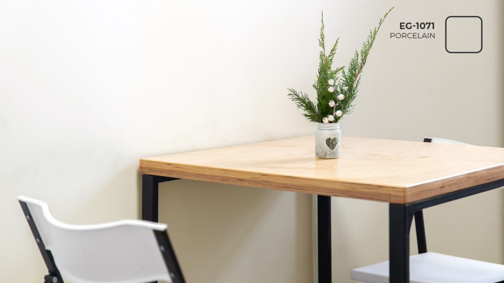 EG-1071 Porcelain merupakan pilihan warna yang tepat untuk menjembatani kelembutan dan elegansi. Warna yang berada di tengah palet putih dan krem ini mampu memberikan sentuhan klasik pada ruang tanpa terlihat membosankan. Warna ini cocok digunakan di ruang makan atau kamar tidur yang membutuhkan suasana rapi dan menenangkan.